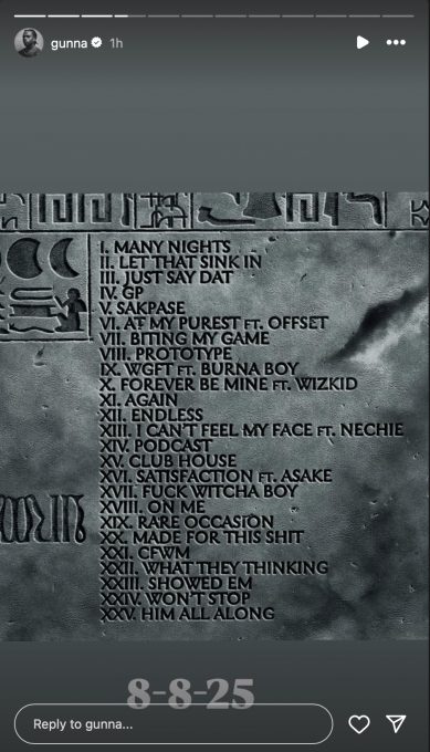 Tonight, the Atlanta rapper has unveiled the official track list for the new LP. There are a whopping 25 tracks, with features from Offset, Wizkid, Burna Boy, Nechie and Asake. Check it out in full below, courtesy of Gunna’s Instagram.