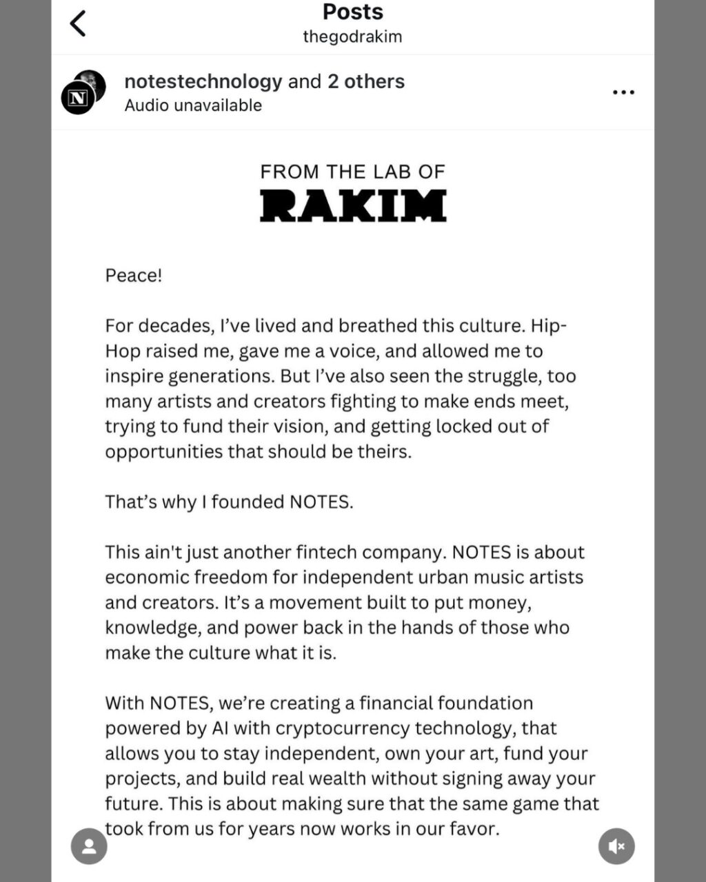 From raising capital via lenders and creditors to resources for understanding the music business ecosystem, NOTES claims to provide urban artists with resources that are otherwise inaccessible. “We do this for the culture, by the culture, so the next generation doesn’t have to sacrifice ownership to survive,” Rakim mentioned in his letter. For some reason, the post seems to have been taken off IG, but below is a screenshot of the letter.
